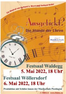 Herzliche Einladung zur Aufführung unseres Schulmusicals AUSGETICKT? - Die Stunde der Uhren. „Sekunden zerhacken, Minuten…